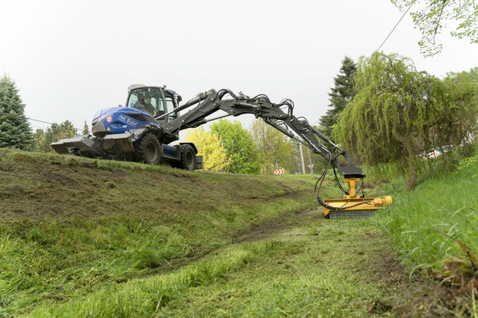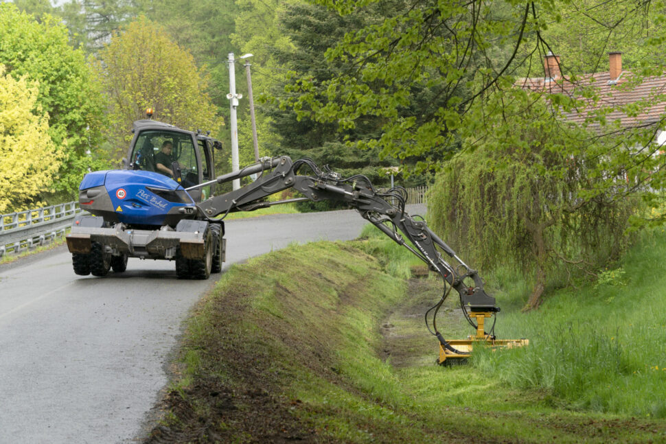 Dlouhé rameno stroji umožňuje mulčování i ve špatně přístupných místech.